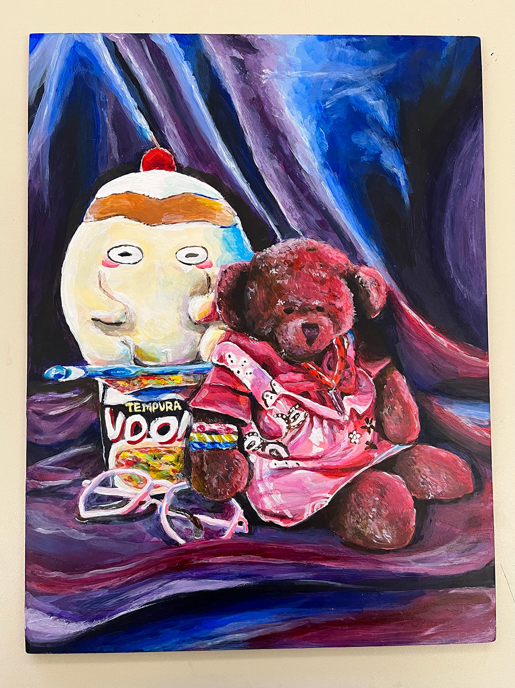 For this autobiographical still life, I chose 5 objects: my glasses, a crochet hook, my childhood bear, an instant noodle container, and a plush I earned from an arcade. I chose my glasses because that’s usually what people remember most about me, the crochet hook because I like to crochet, Wawa (my childhood bear) to represent my childhood, the instant udon noodles to represent my love for food, and the arcade plush that I earned with my cousins. I believe I achieved good values within this piece.