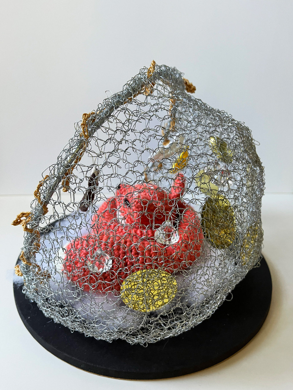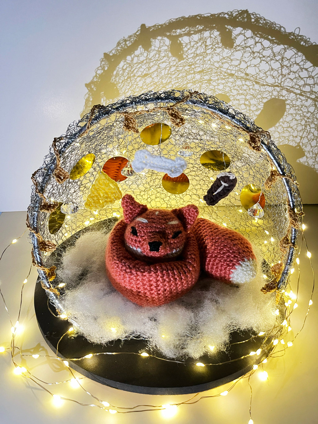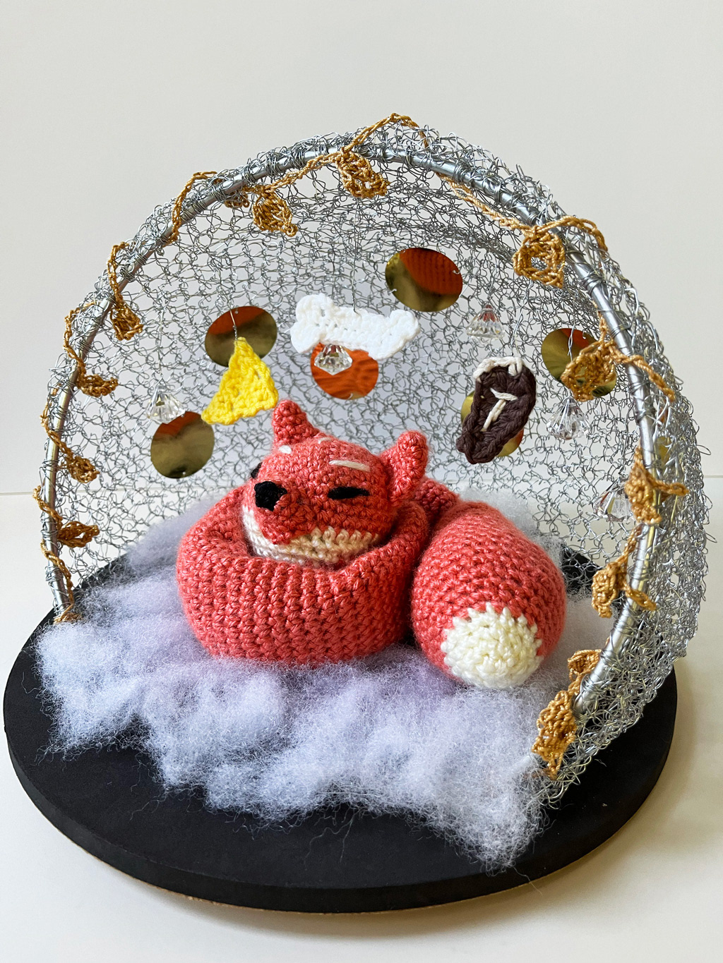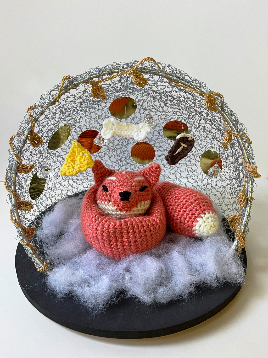 Sparkly beads float around an orange animal, reflected around with the golden plates in the back of a wired structure. Different types of foods, such as bone, cheese, and meat, float above dangling from the high ceiling. This is my interpretation of what is going on in my dog Matto’s head when she is sleeping. She is always curled up in a circle and speaking every so often which leads me to believe she thinks of food. As my first time experimenting with crocheting wire, I believe I was able to achieve a homely dreamy atmosphere around Matto. The wire was difficult to work with but it helped with the idea of the piece. A single piece of wire was able to be bended and knotted in different ways allowing for infinite numbers of possibilities in the dream. Matto was able to imagine a burrow, a cozy tight space for her to relax and drift off in her sleep…