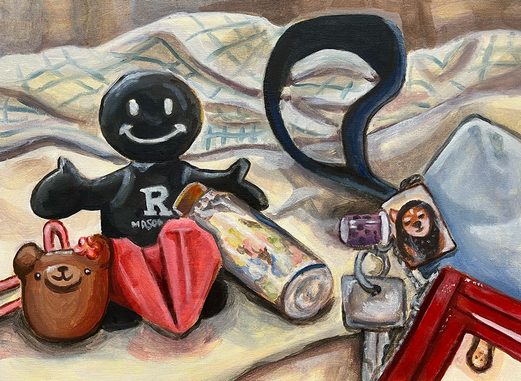 In this still life, I wanted to capture daily objects that were lying around in my pockets or backpack in my first year of college. I included my keychain holder with my Rutgers ID. I also had a Mason Gross phone holder figure that I got recently at an event, alongside an origami paper star I made from the involvement fair, a keychain, and a mini clear bottle that my friend gifted me before we left.