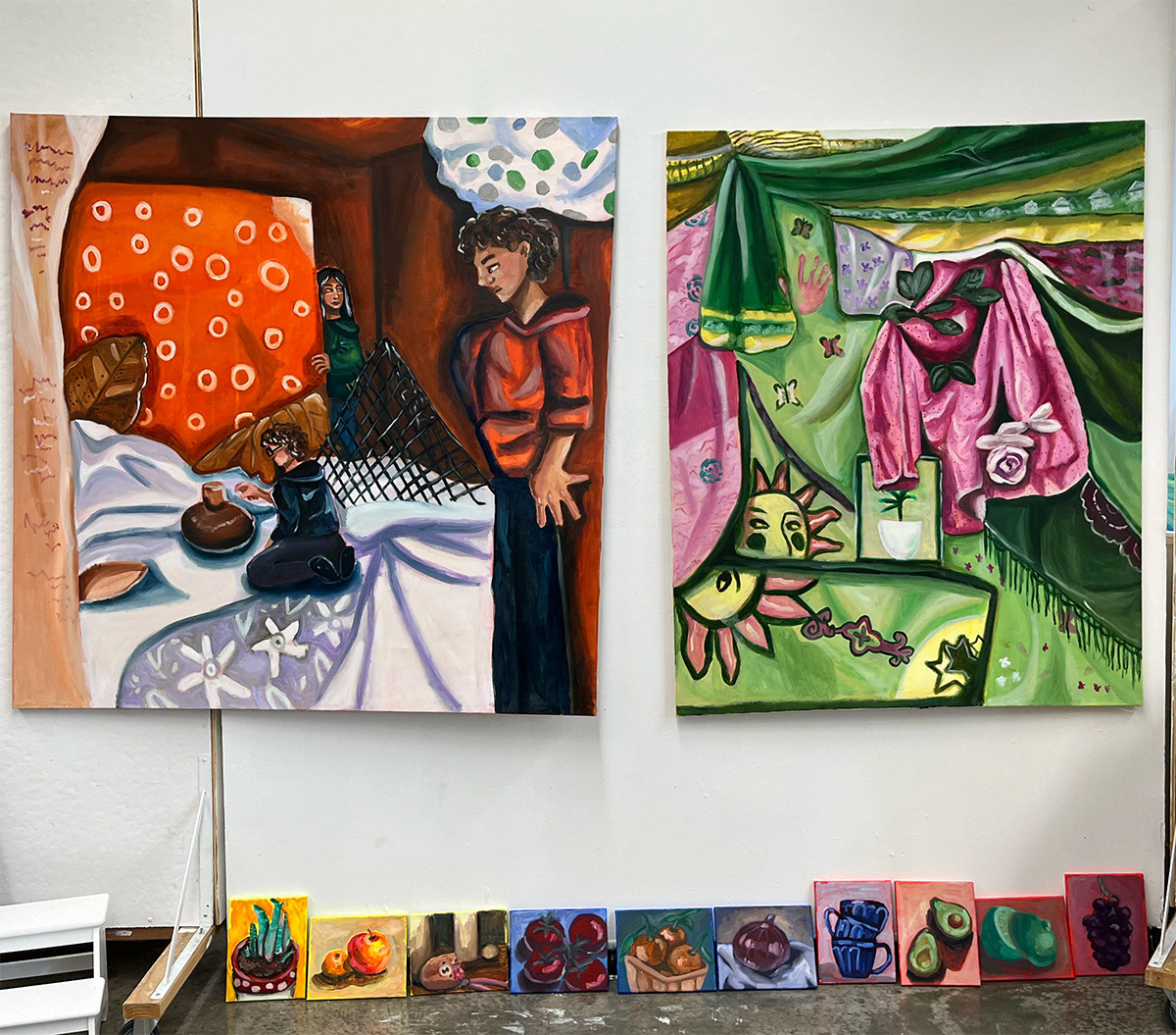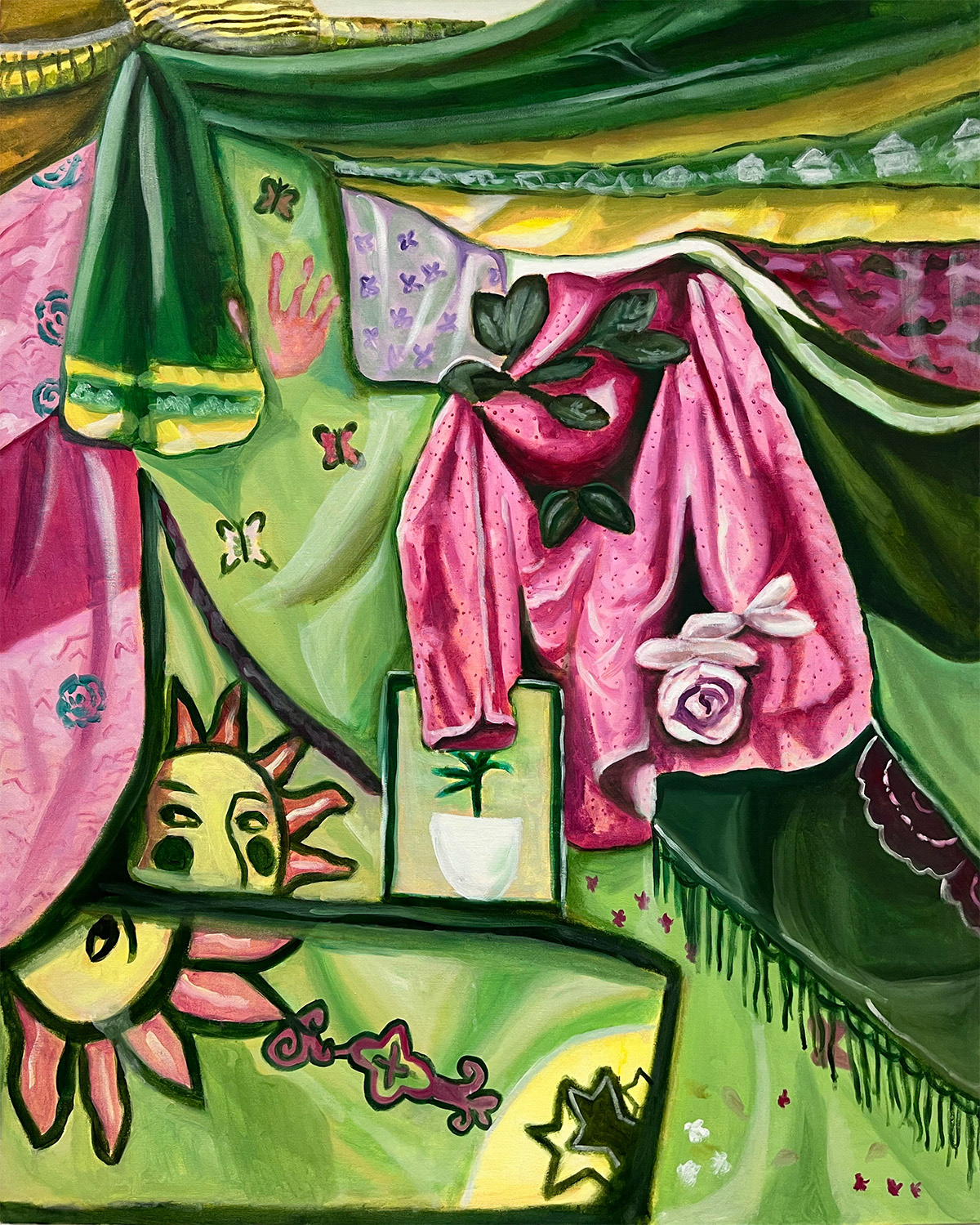 This was part of my final for my class, Painting 1A at Rutgers MGSA. We were each given a specific painting to reference our color palette. I got a green and pink painting by Jennifer Packer. Each of my classmates donated a piece of fabric, which we pinned onto a wall to paint from.