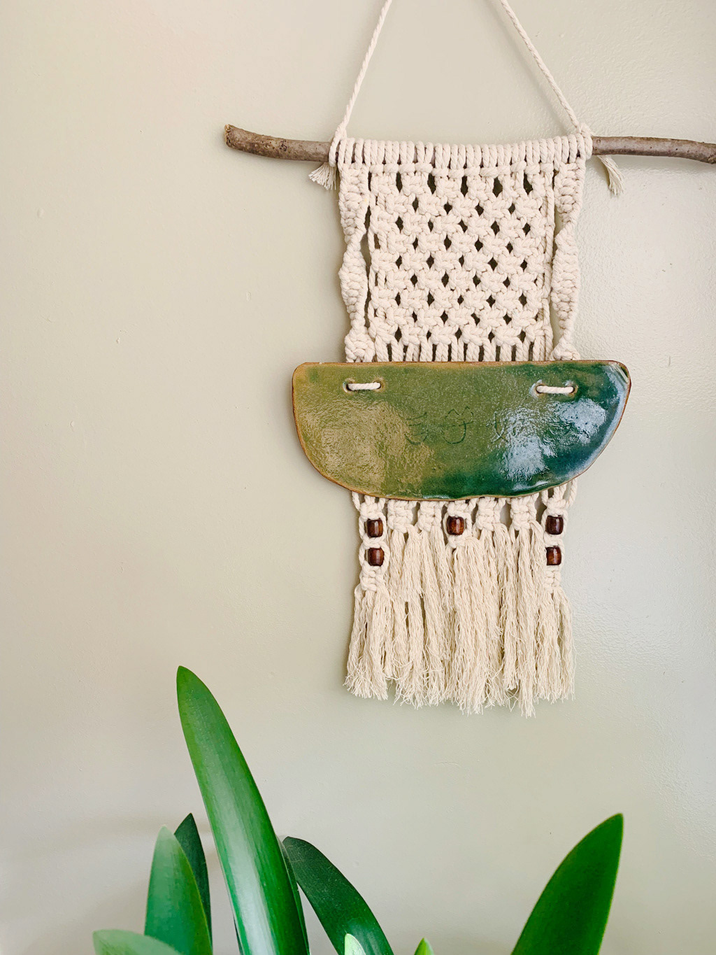This project is a collaboration between 2 generations. The green clay plate was made by my grandma. I incorporated the plate into my macrame wall hanging.