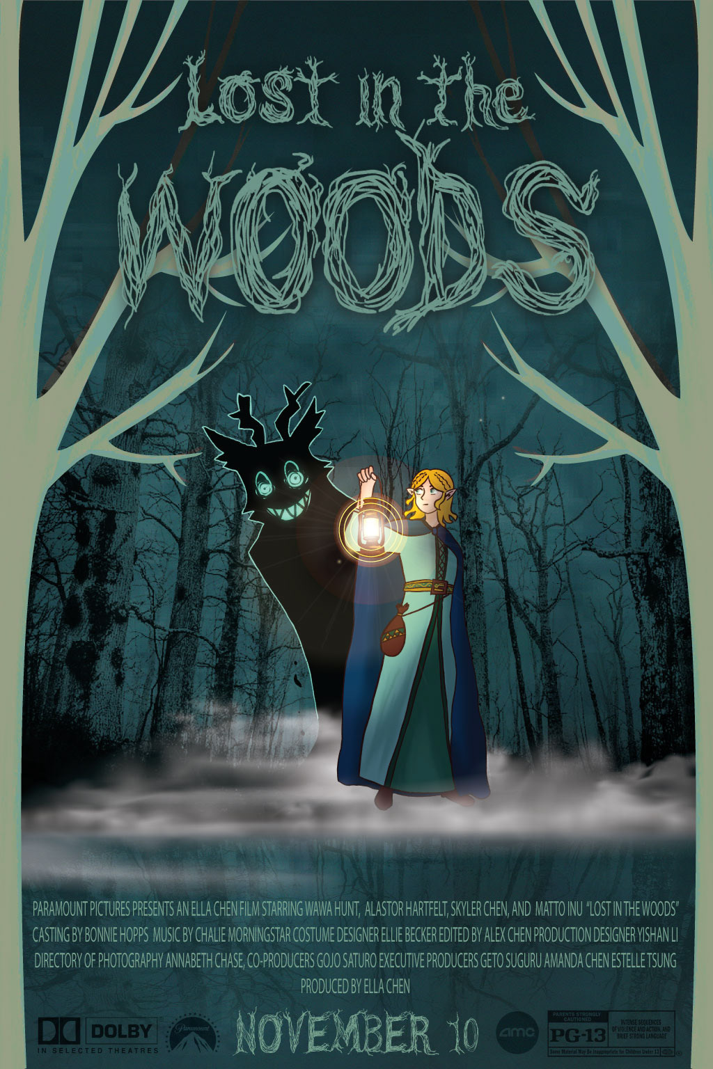 I created this movie poster for my Graphic Design class at school. I drew the girl and the monster on Procreate and uploaded it into Illustrator, where I laid out the poster. At the bottom, there are hidden Easter eggs with the names of close friends, as well as some characters I liked from shows and books.