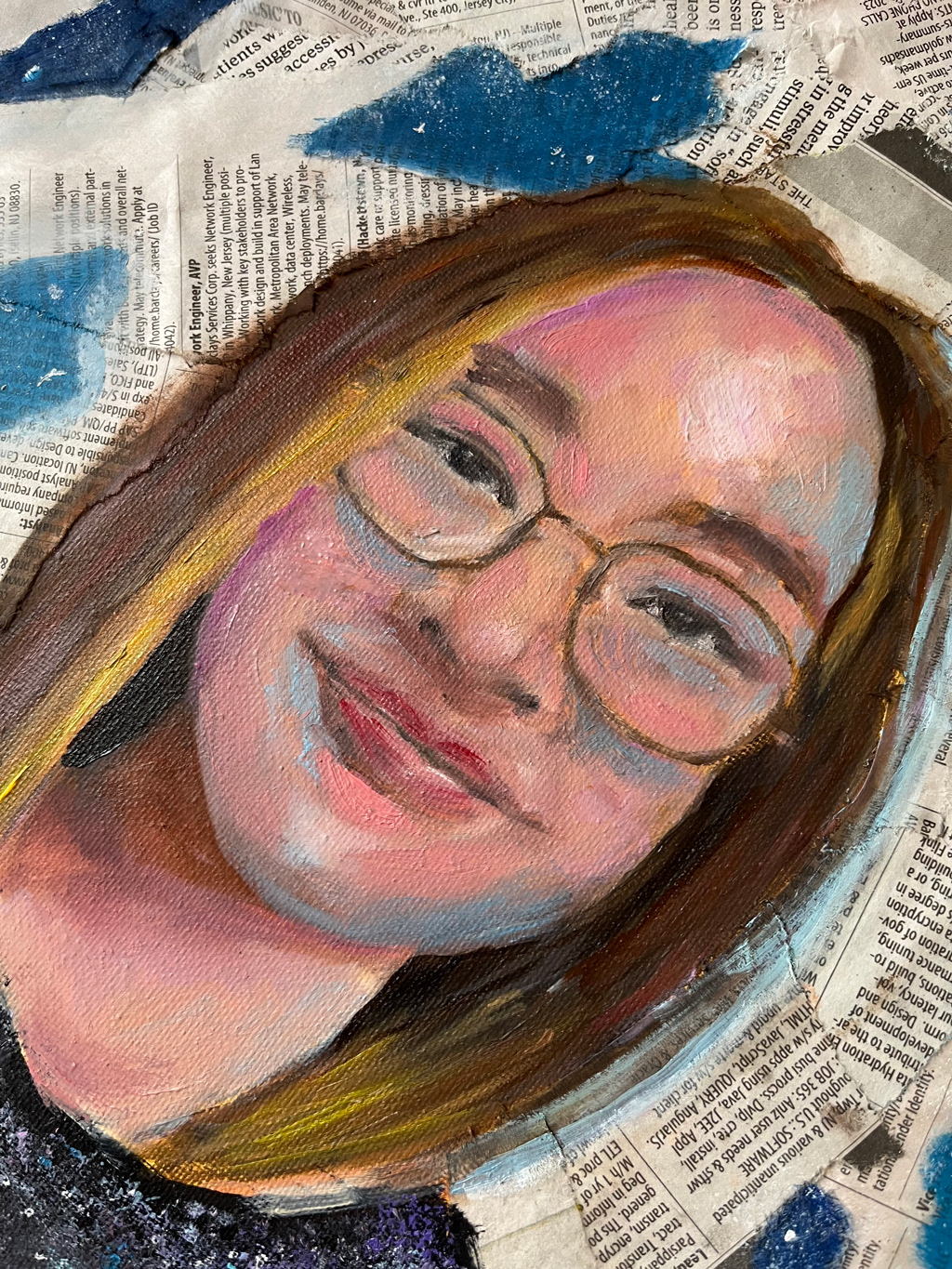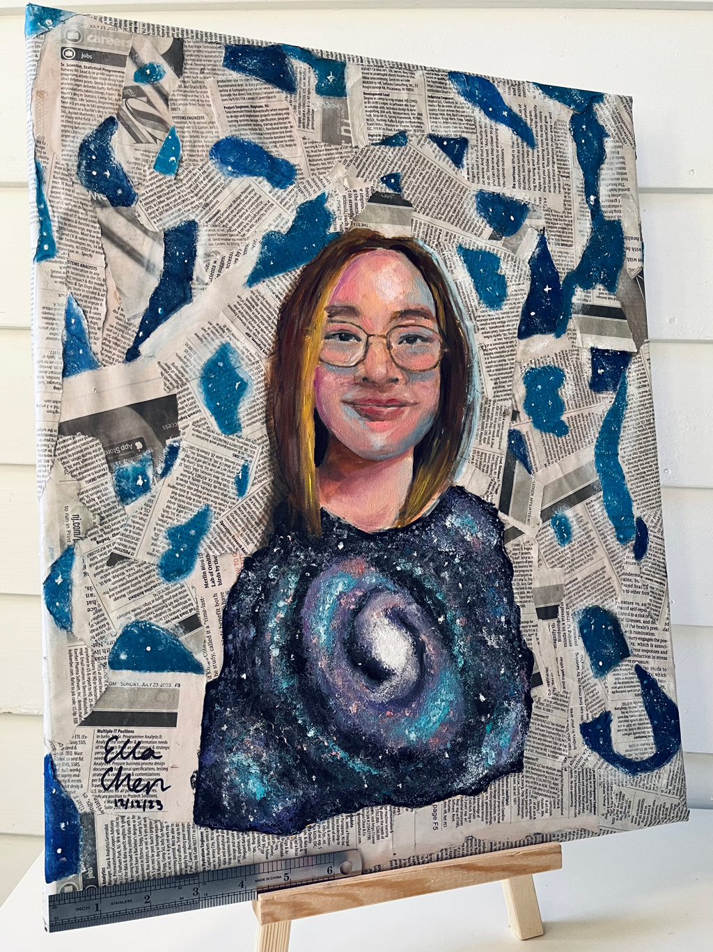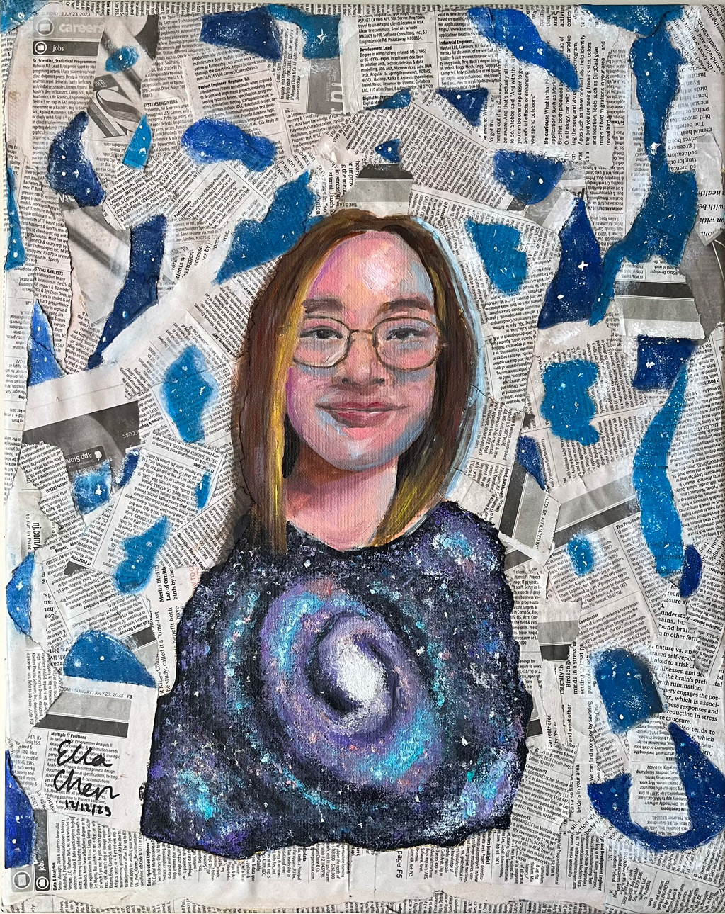 The career newspapers surround me, representing the various paths I could take. There are gaps in the collage in the background, opening up into different galaxies. I am in the center of this piece, trying to figure out what to do with my future. I didn't want to be chained to a desk, working endlessly. I want a future in which I can continue creating and expressing myself, as shown by the splashes of color on my face. I needed to find my own world within.