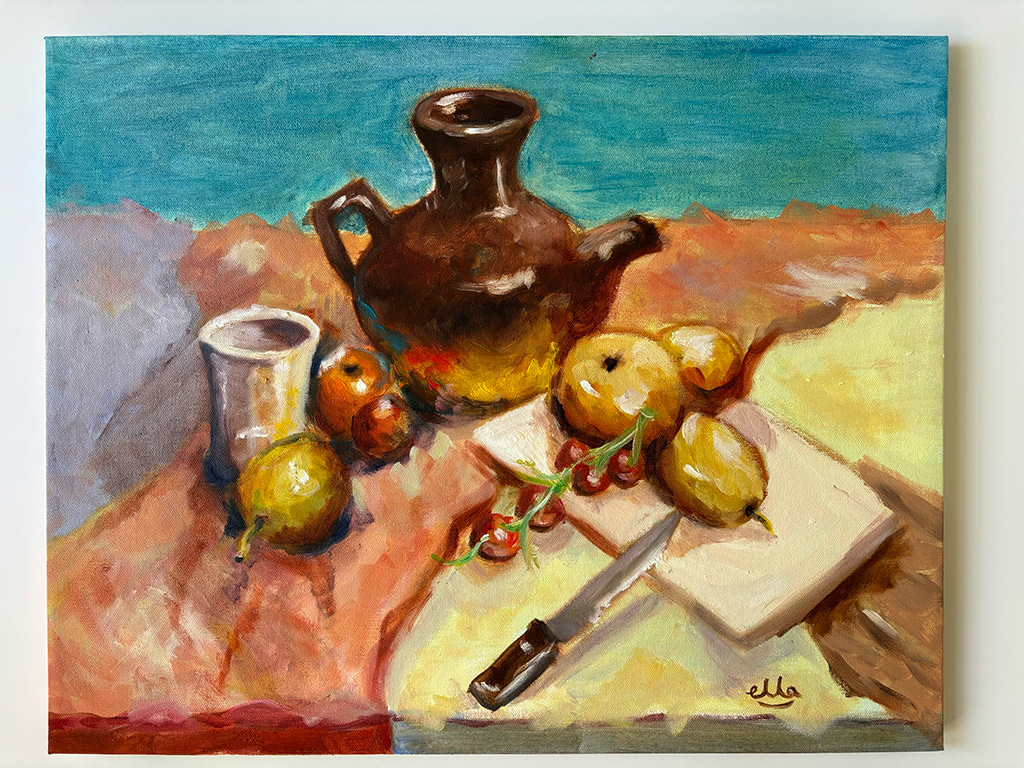 An oil painting still life where I tried to use big brush strokes to capture the same amount of detail.